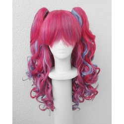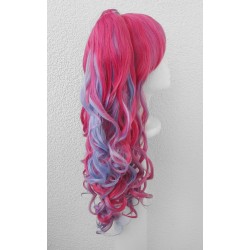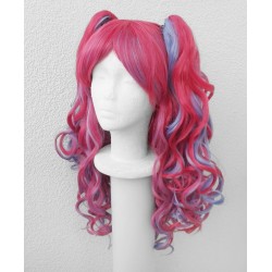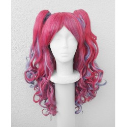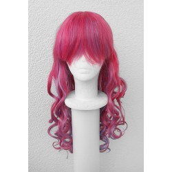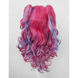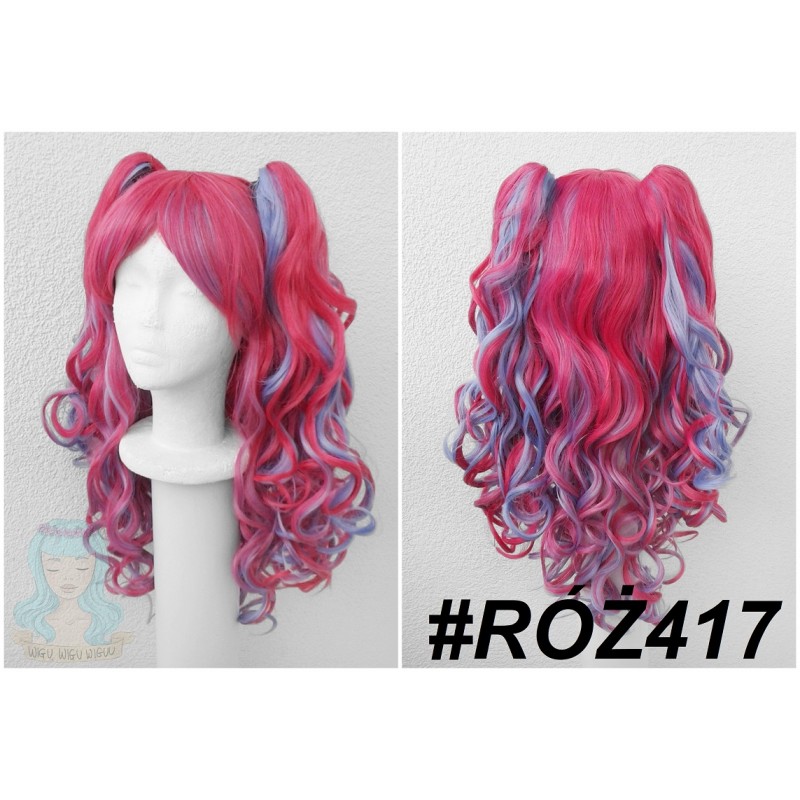 Różowy wig z fioletowymi pasemkami i kitkami.